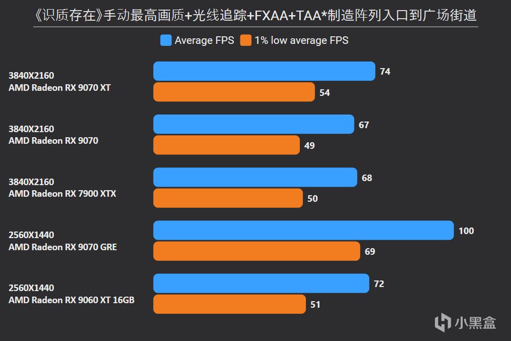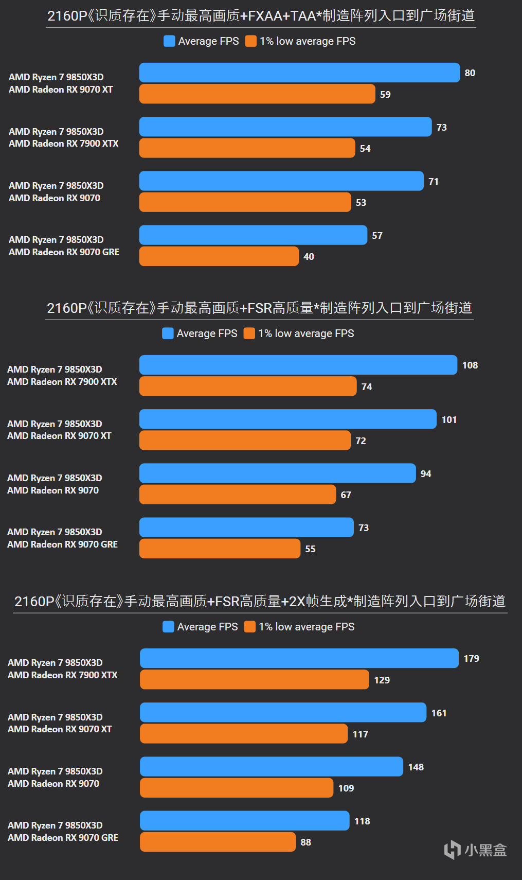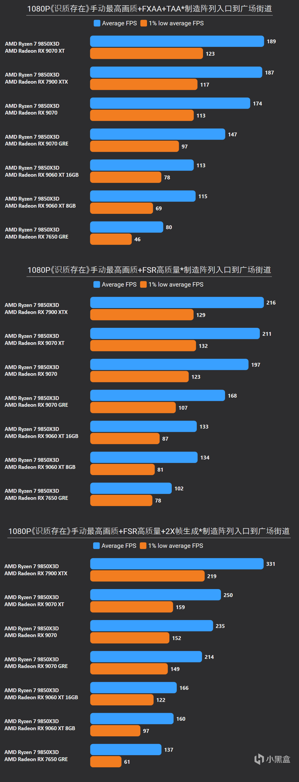 RX 7900 XTX和RX 9070 XT原生抗鋸齒性能表現趨同,但在開啓FSR之後,前者幀率會更優勝,尤其是FSR+插幀能拉開巨大差距,個人猜測是因爲一來FSR 3計算負荷沒有FSR 4高,二來則是降低渲染負載時性能權重更偏向傳統核心規模。