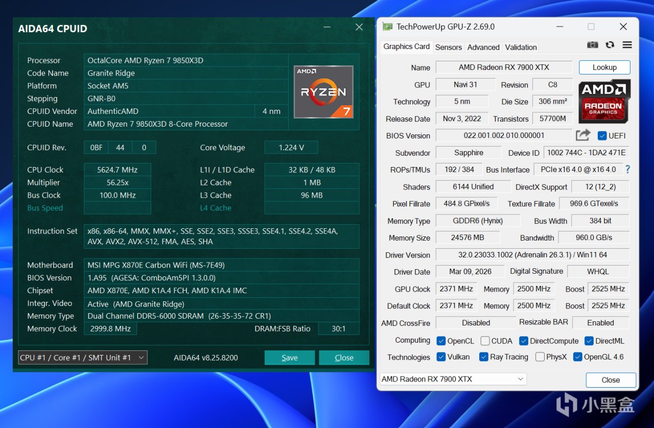 測試配置快速介紹一下,CPU使用的是銳龍7 9850X3D,設置PBO ENABLE檔,可最大程度降低CPU性能瓶頸,主板是微星MPG X870E CARBON WIFI暗黑,搭配兩根DDR5 6000C26 16GB*2內存套裝,操作系統則是Windows 26H1最新版本,顯卡驅動是AMD Adrenalin 26.3.1WHQL最新版本。