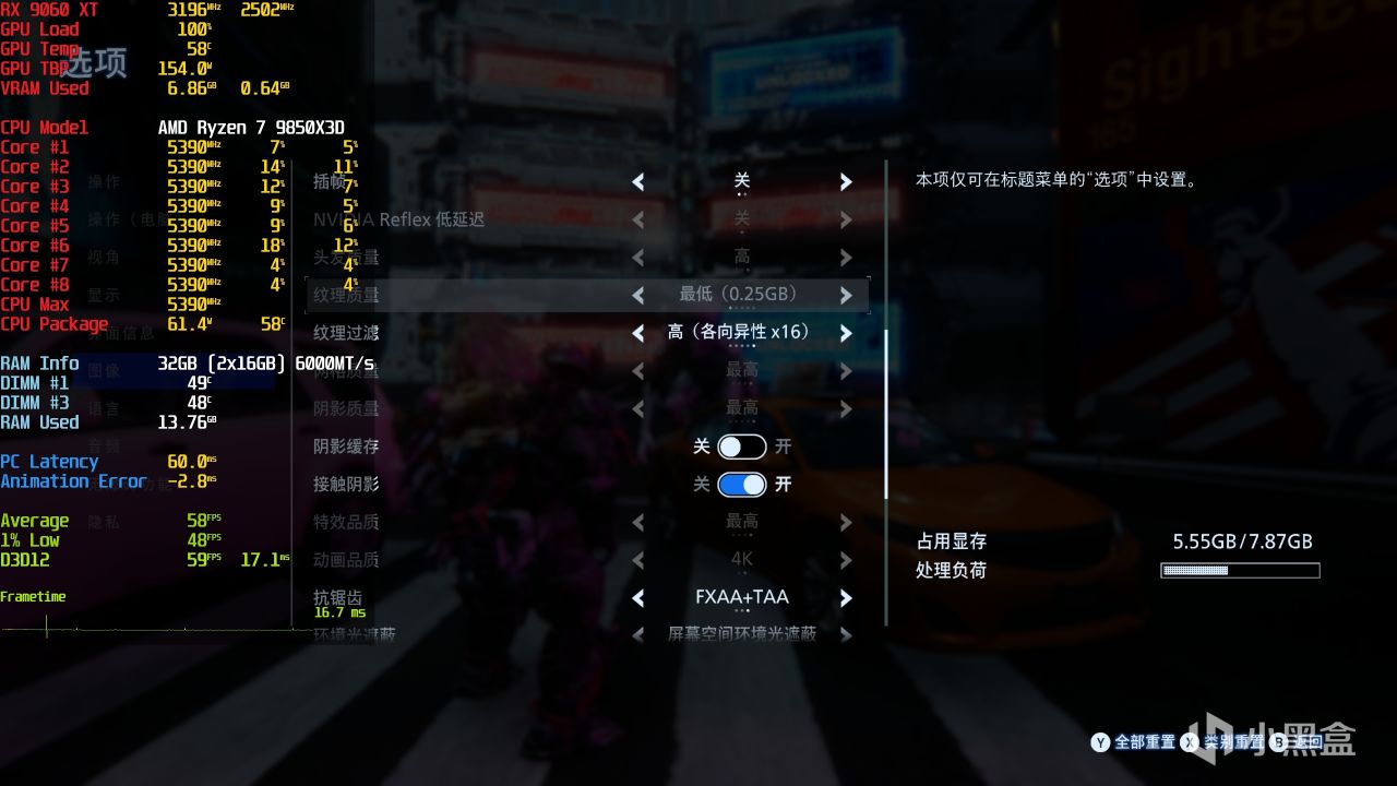 2K分辨率,RX 9060 XT 8GB和16GB兩者原生平均幀數仍輕鬆超過60fps+,不過1% LOW幀無疑是16GB版本更穩定,畢竟顯存溢出更嚴重了,按照上述方法優化一下,RX 9060 XT 8GB也能完美跑起來,且對於畫質影響不會特別大。