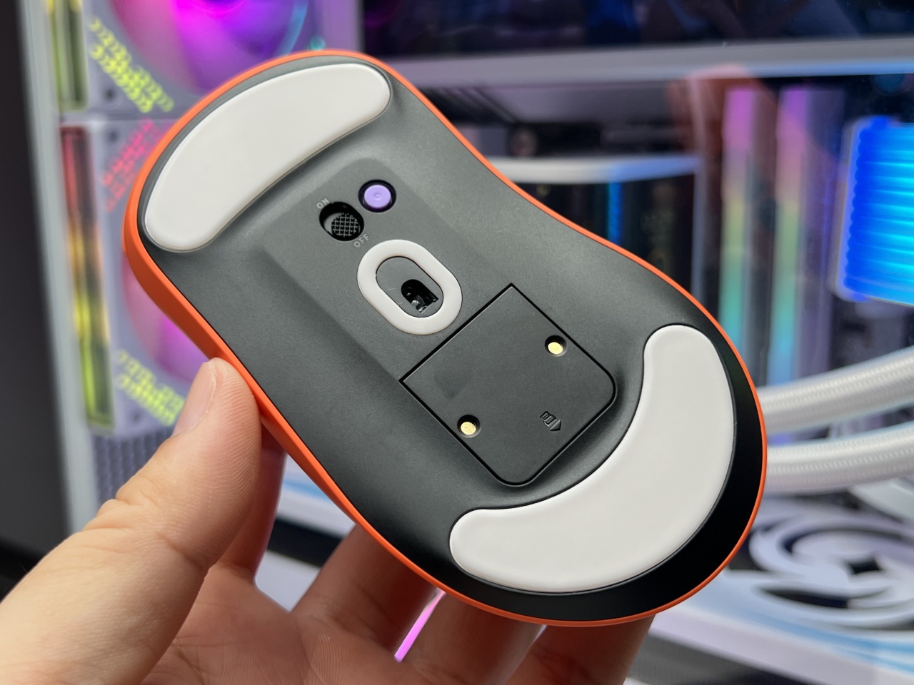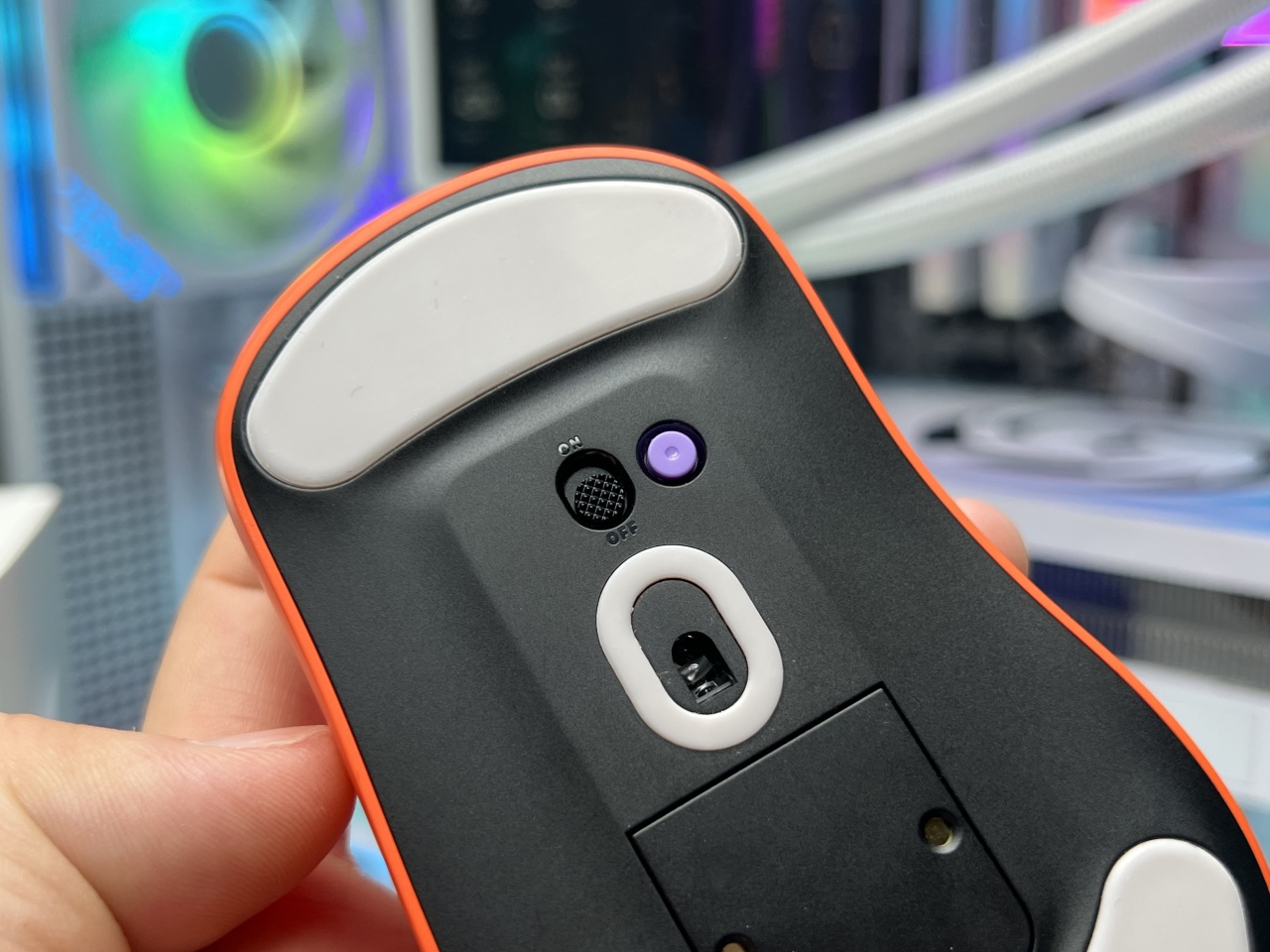 鼠標底部除了兩塊PTFE大腳貼外,紫色的是DIY自定義功能鍵,你可以將它設置成DPI調節鍵,具體自定義功能看自己需求。