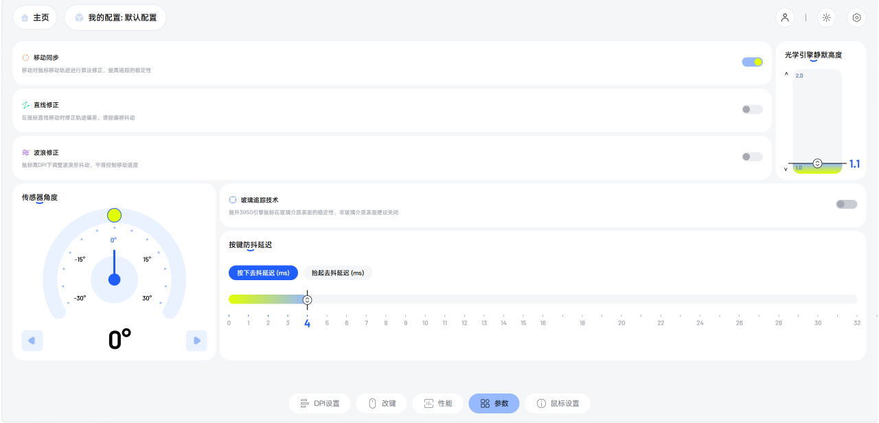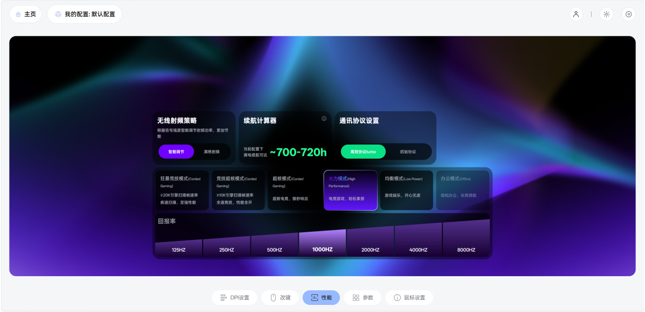 驅動內有六種鼠標模式可選,開啓鼠標的狂暴競技模式能發揮PAW3398傳感器的極致性能,能帶來≥20000FPS的靜態掃描幀率,鼠標只要有細微挪動,傳感器便會檢測到並做出反饋,適配需要極致微操的遊戲場景。