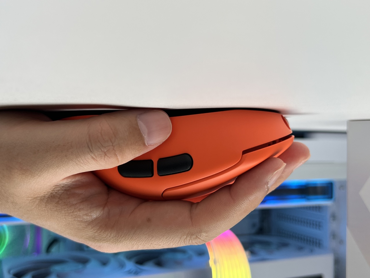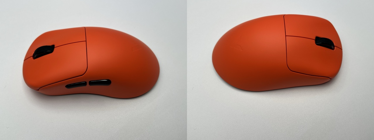鼠標左側非常飽滿,對比右側做了非常明顯的收腰,搭配飽滿的尾部,拇指能自然落到拇指位上;分離式側鍵高度適中,正常握持和拇指有2-3mm的間距,誤觸概率偏低。