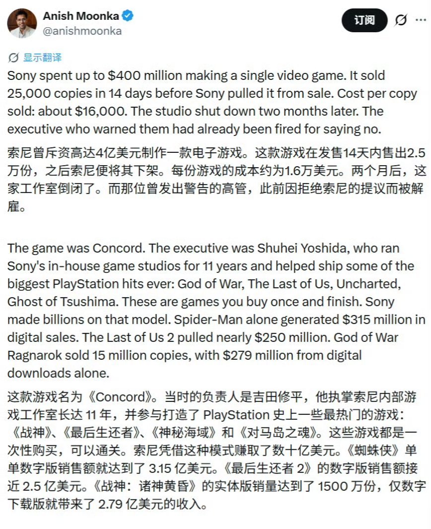 而作为该战略下为数不多正式上线的核心第一方产品,索尼耗资约4亿美元打造的《星鸣特攻》,发售后仅14天销量便仅有2.5万份,随后迅速宣布下架,其开发工作室也在两个月后被关停。
