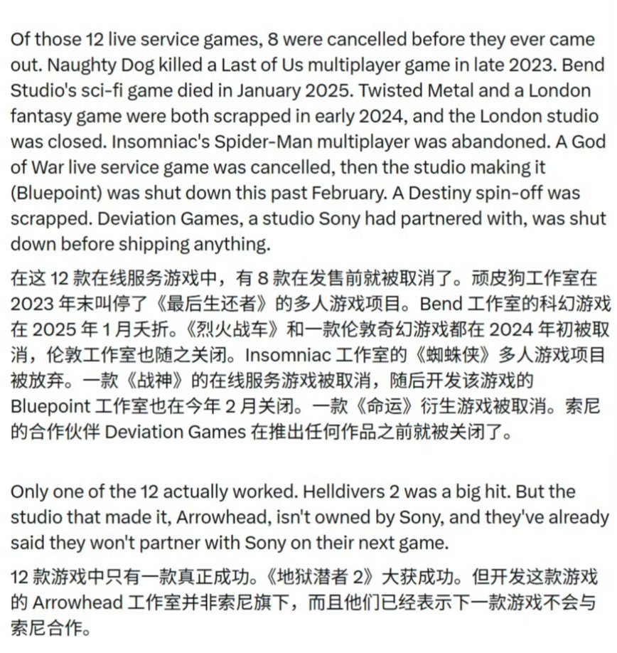按照索尼当年制定的规划,原计划在2025年前推出12款在线服务游戏。截至目前,已有8款项目在发售前陆续取消,其中不乏《最后生还者》《战神》《蜘蛛侠》的多人衍生作品。