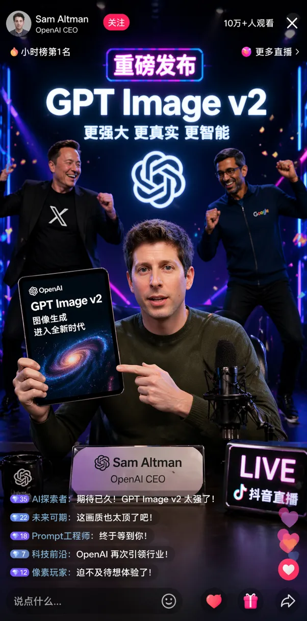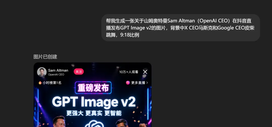 例如本文的第一张,奥特曼直播,也是 Image v2 一句话生成的: