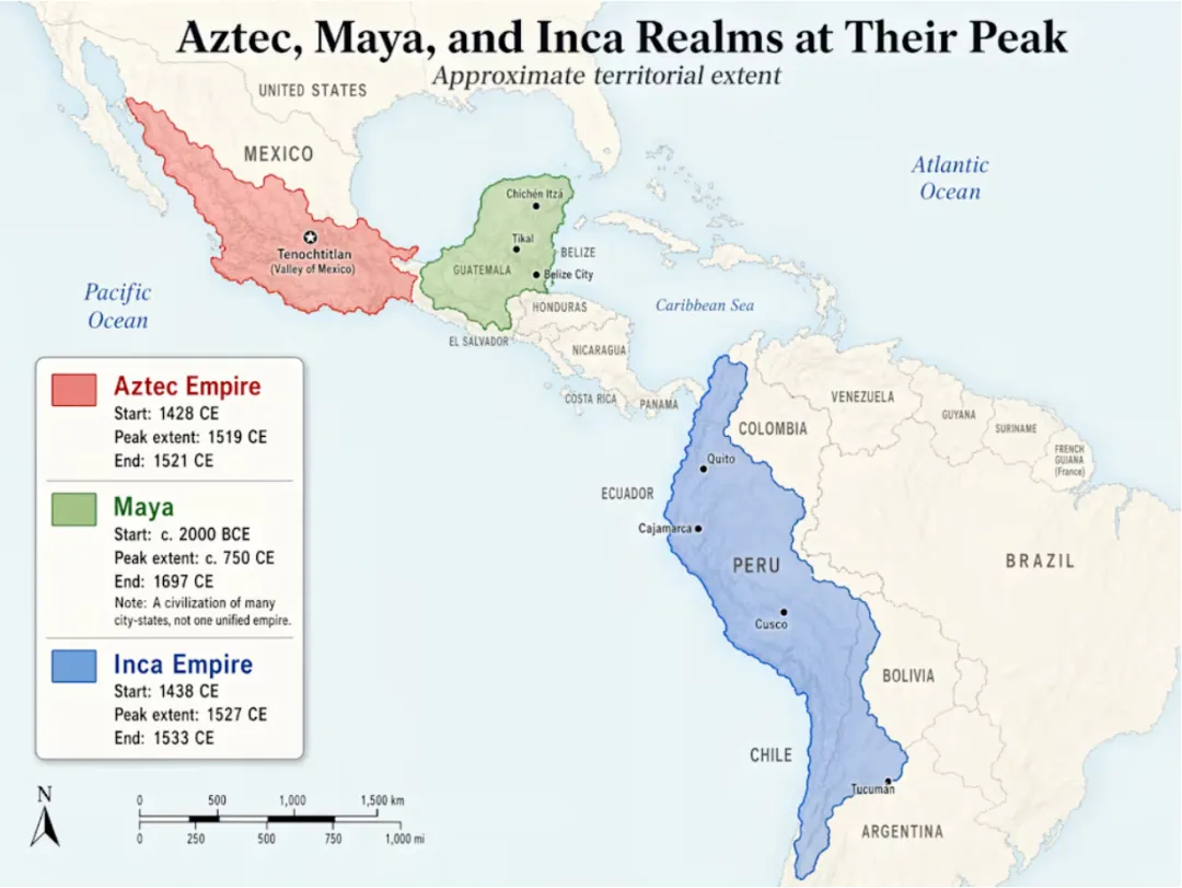 Image v2生成的阿兹特克、玛雅、印加帝国在其鼎盛期的地图