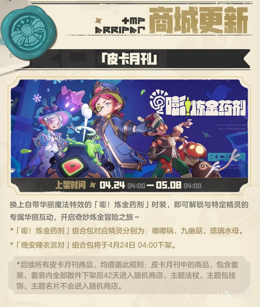 04月24日「嘭!炼金药剂」时装限时上架;同时「晚安睡衣派对」时装下架