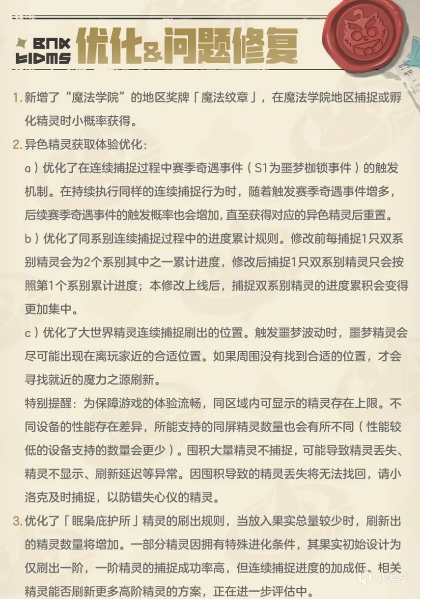 异色精灵获取优化:赛季奇遇触发概率逐渐提升;连续捕捉累计优化;优化噩梦精灵出现位置