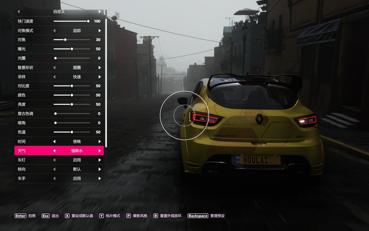 驾驶指定车型前往户外,打开照相系统并将天气修改为"降水",随后进行拍照即可完成任务。