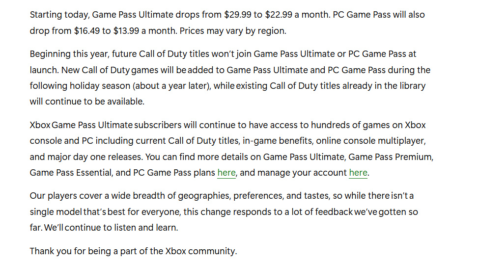 微软宣布自今日起,Game Pass Ultimate 的月费价格将从 29.99 美元降至 22.99 美元,PC Game Pass 的月费也将从 16.49 美元降至 13.99 美元。不同地区的价格可能会有所差异。