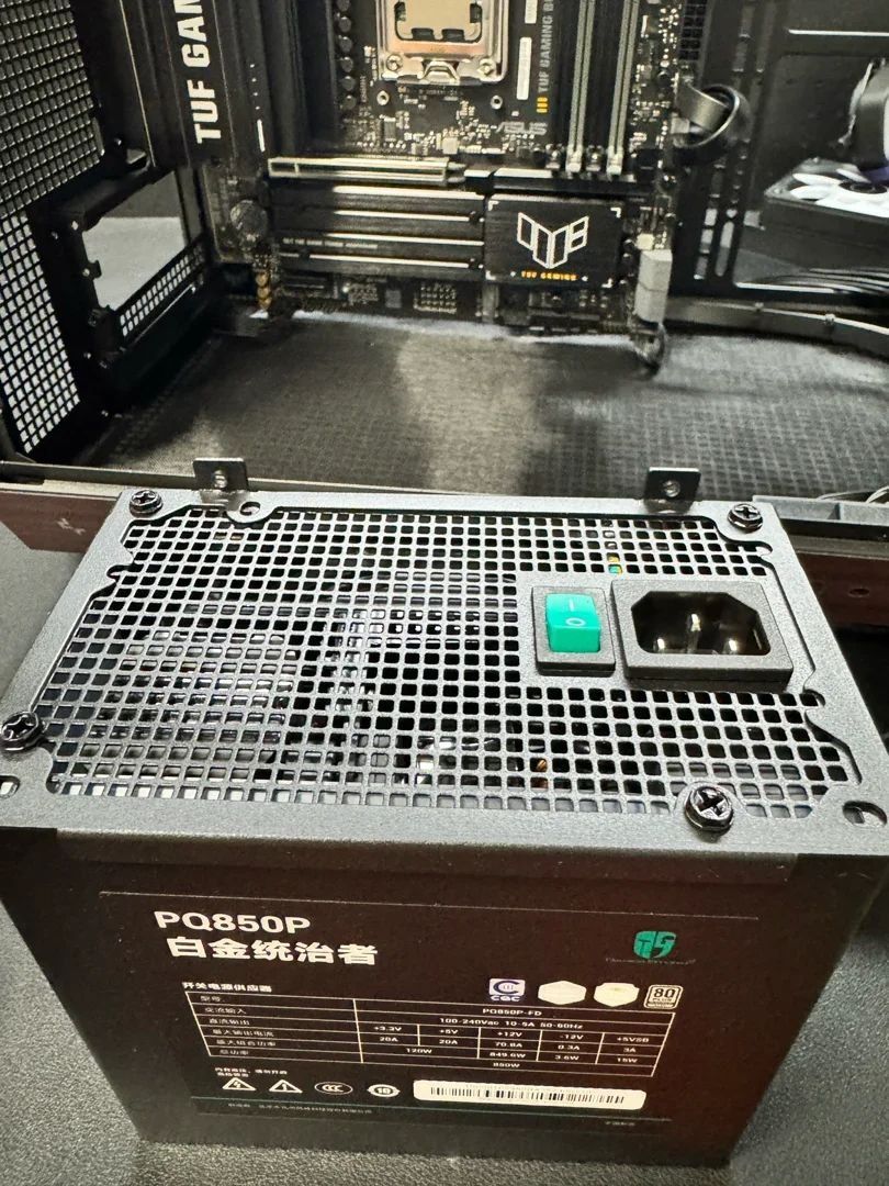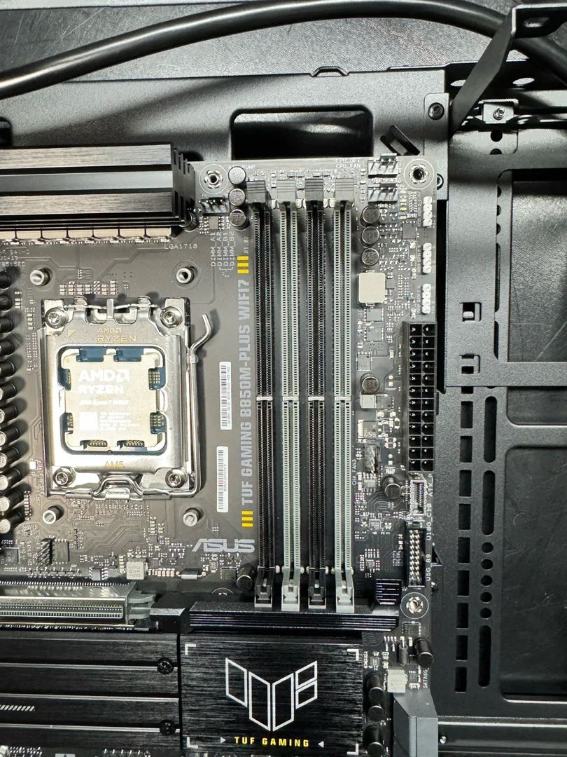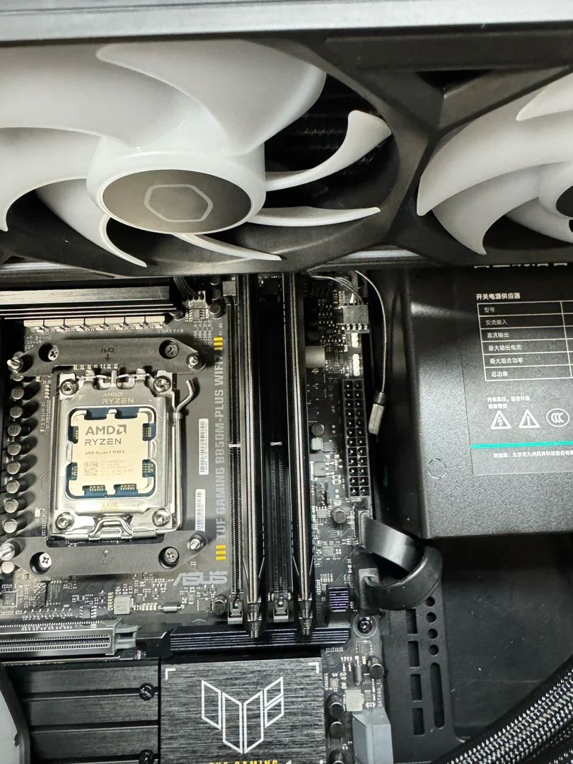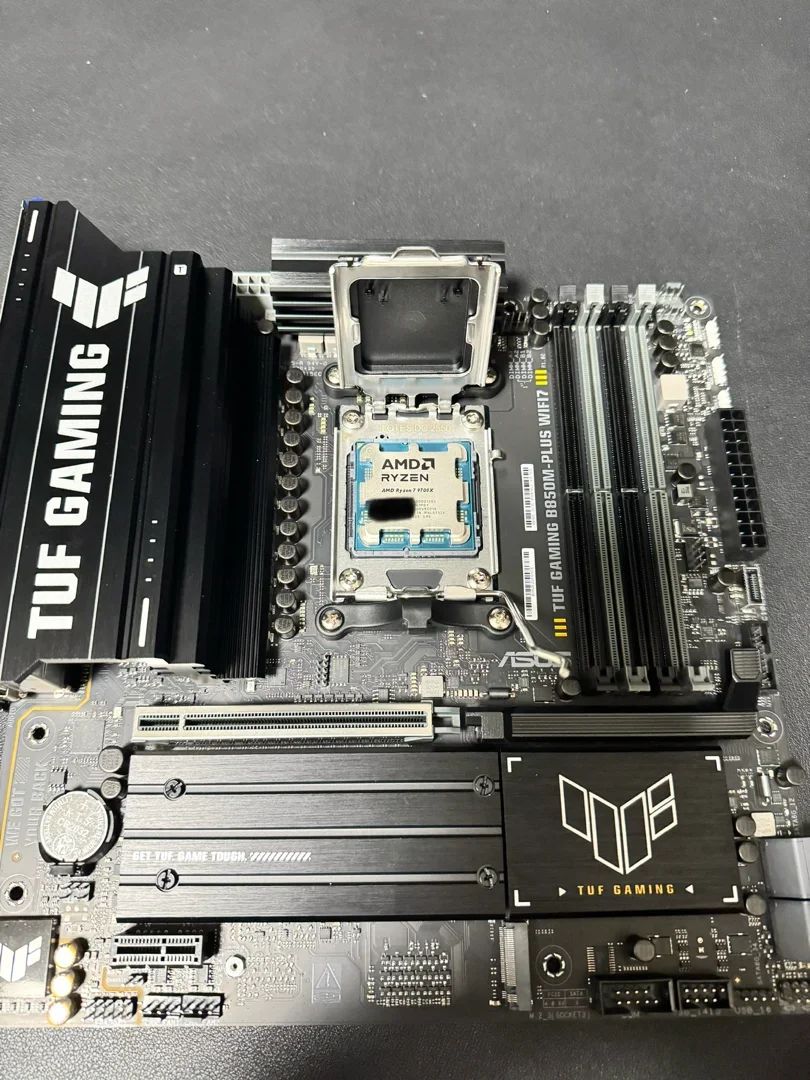 无压痕的全新9700X散片,对准左上角的三角标识放入CPU槽内即可,先放CPU,按压扣具后保护壳会随着脱落。吃完饭再装,手不会抖!