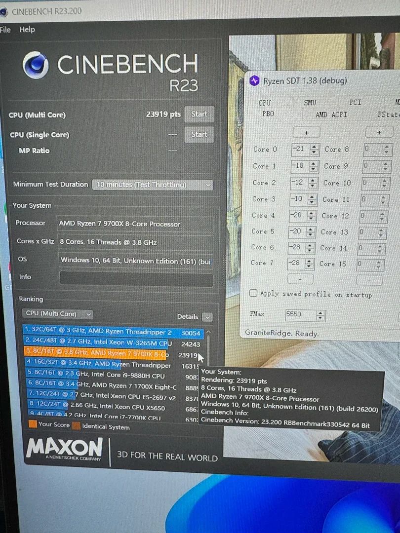 R23 多核 10分钟,23919分,于PBO来说这分数正常范围内,温度表现也是正常范围内。