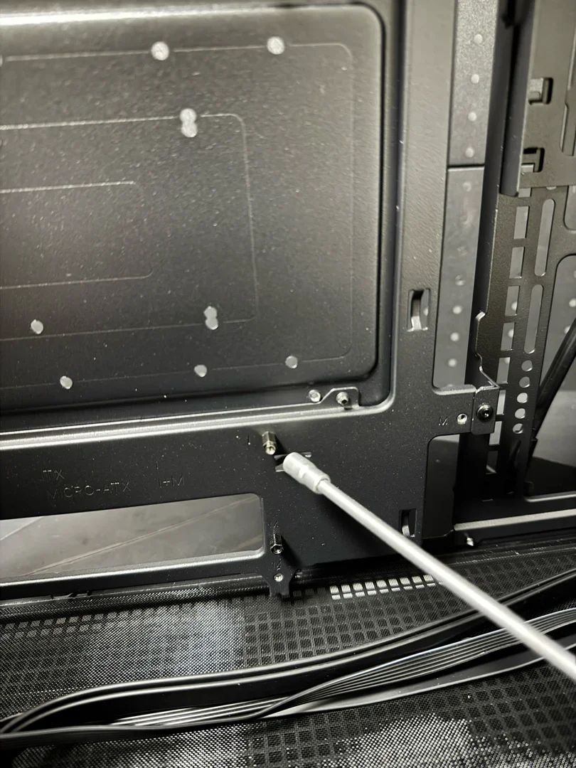 对应MATX主板孔位调整底部铜柱的位置,第二排第二颗定位铜柱,向右移一个位置,因为显卡快拆设计挡住铜柱孔位。