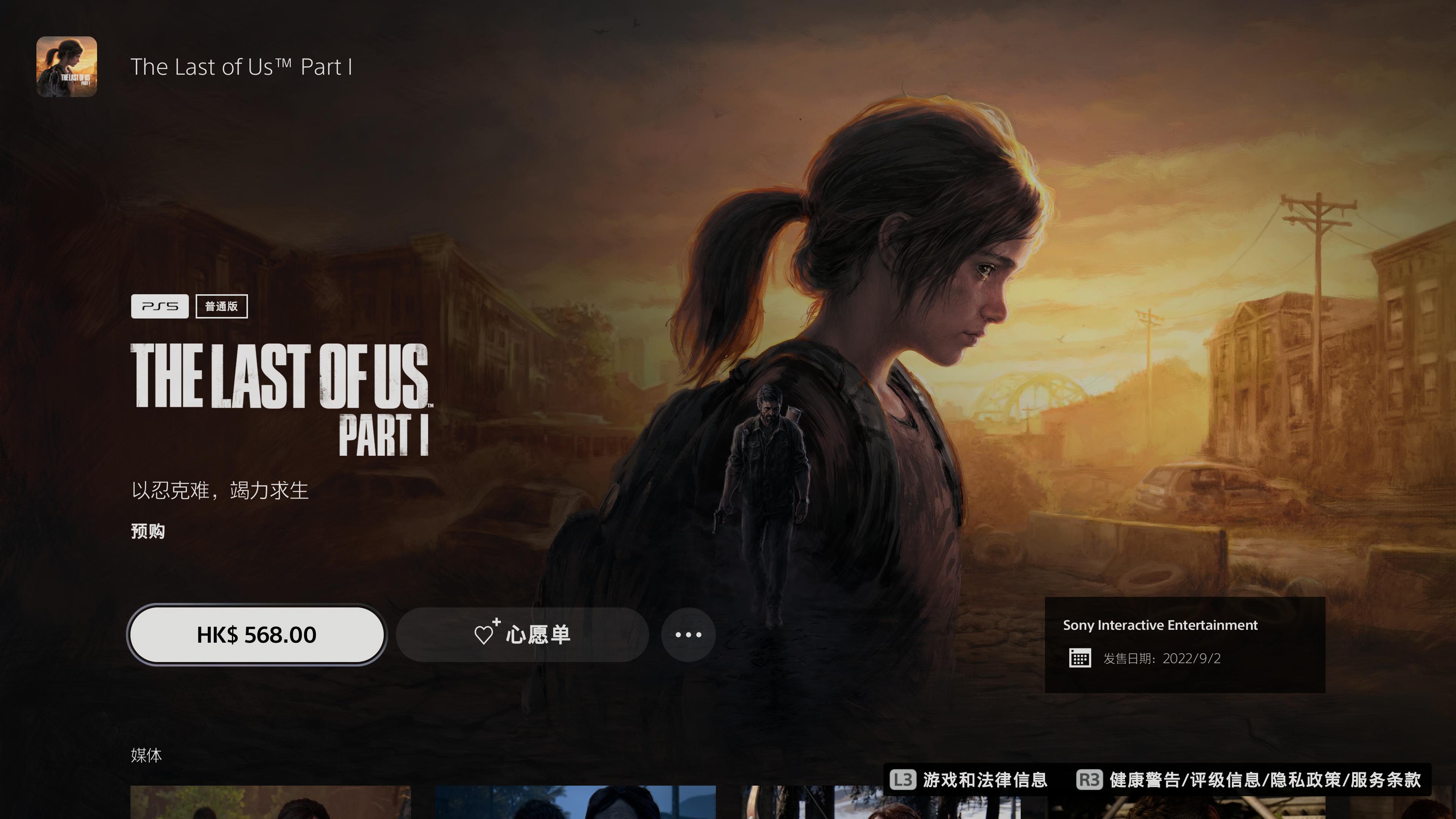 《最後生還者重製版》即將登陸PS5正式發售,日後將登陸PC,遊戲已開啓預購,普通版售價爲568港元,豪華版售價爲628港元。