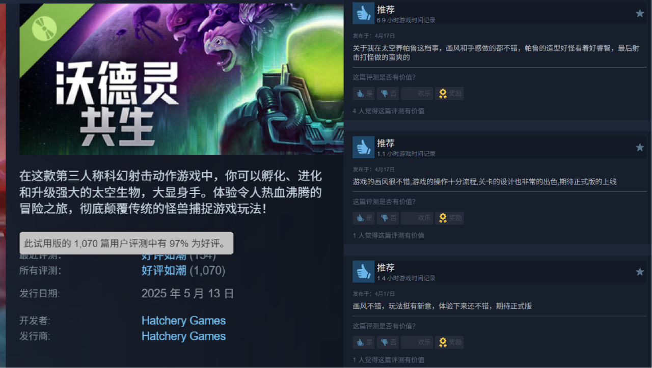 这来自一款太空抓宠+射击战斗游戏《沃德灵/Voidling Bound 》,现已在Steam开放试玩demo,收到1千条评论&97%好评率&好评如潮。