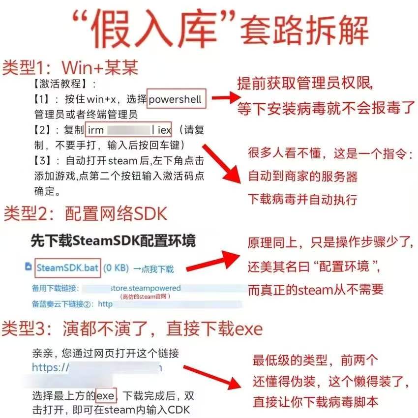 玩家付款后,商家提供无效CDK与“专用激活工具”或代码,诱导用户关闭杀毒软件,运行恶意脚本,篡改Steam本地文件,伪造入库假象,游戏看似在库可玩,实则无官方授权。