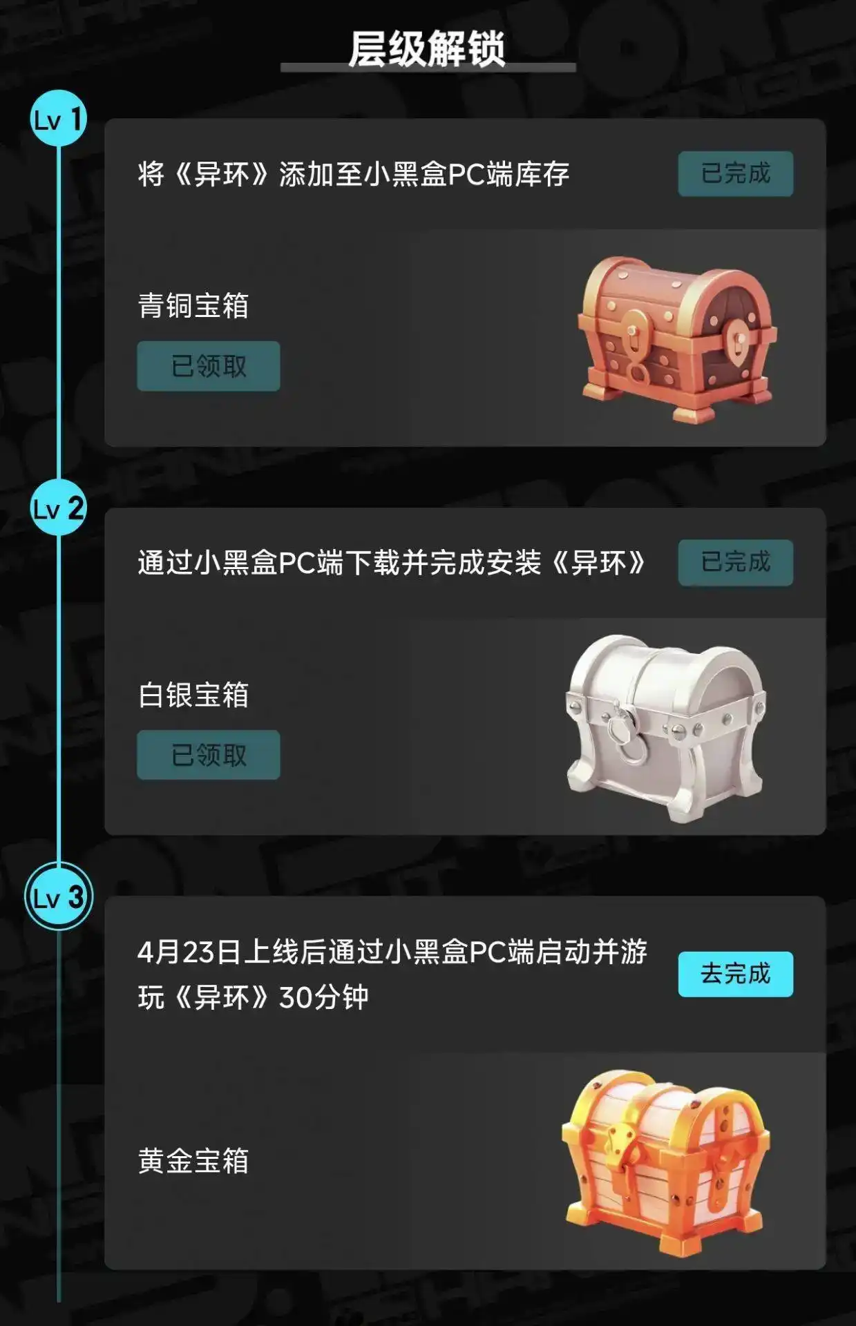 第三步:添加到库(青铜宝箱)下载安装(白银宝箱),启动游玩30分钟(黄金宝箱),即可领取宝箱(有三个宝箱可以开!)