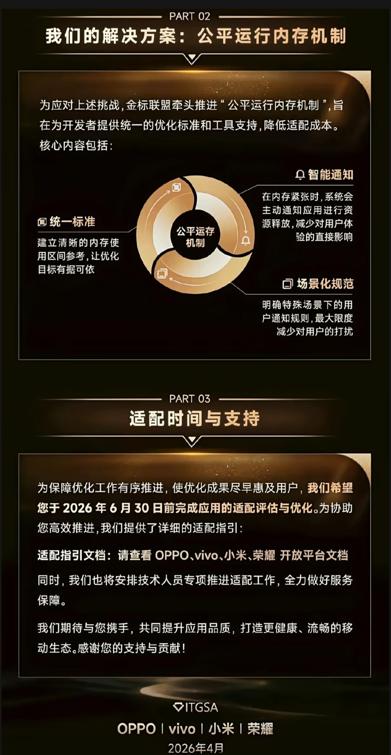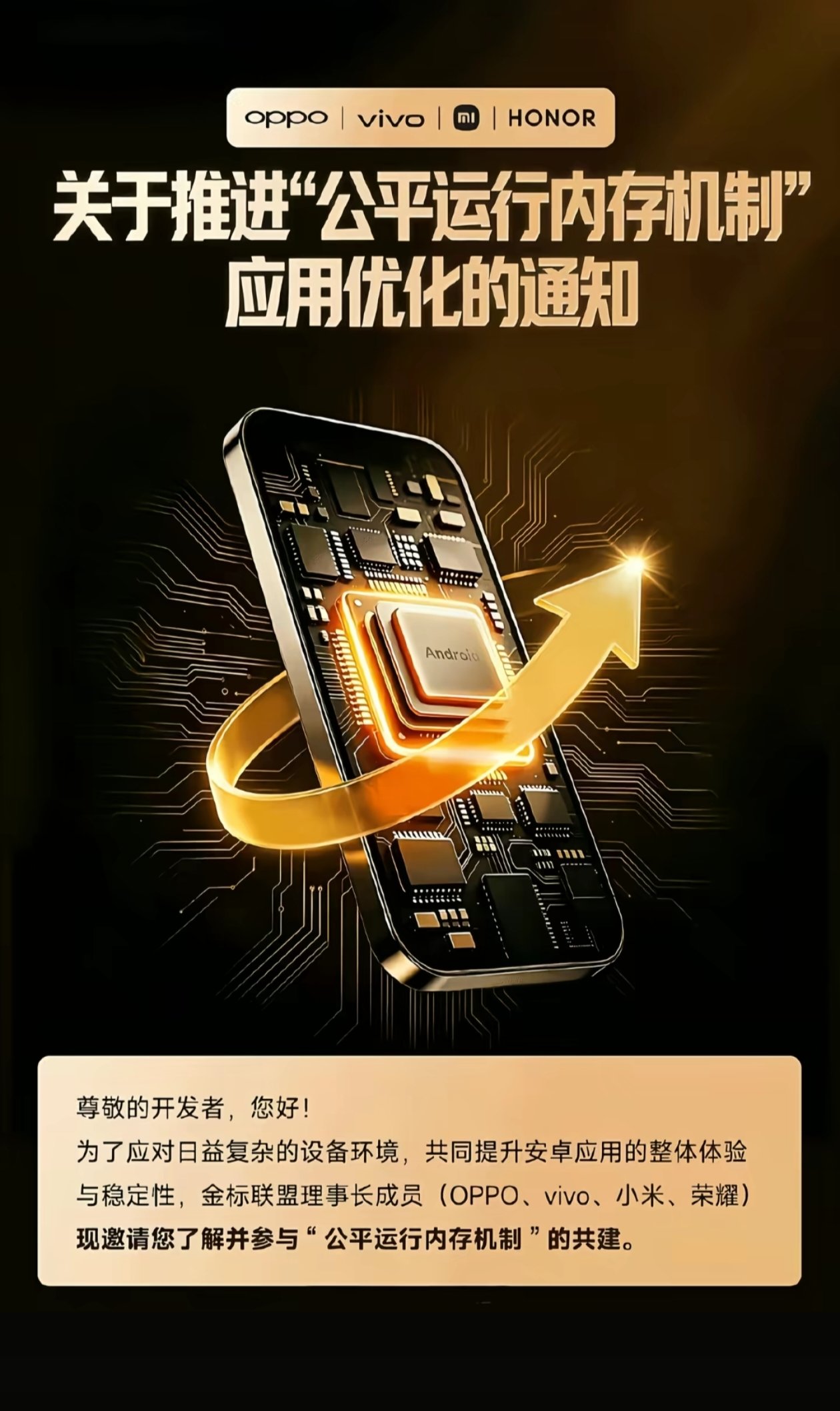 近日,由OPPO、vivo、小米、荣耀组成的金标联盟发布通知,将在全行业推行统一的公平运行内存机制,以整治安卓系统长期存在的内存乱象,改善卡顿、发热、后台应用被误杀、应用闪退等用户痛点问题。
