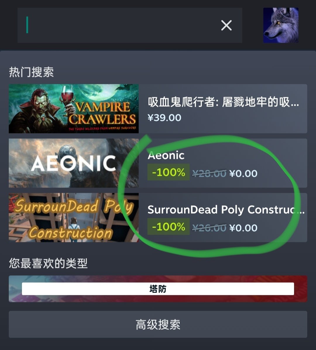 领取方法很简单,打开steam在搜索栏那里点一下就可以看到了,第画圈的这两个-100%的就是了