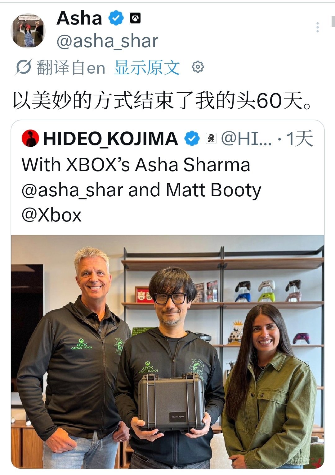 照片中,小岛和布蒂穿着Kojima Productions x Xbox Game Studios的联名外套,还收到一个标有“Xbox for Kojima”的神秘礼物盒。阿莎·夏尔马在回复中称这次会面是“结束她上任前60天的最美妙方式”。