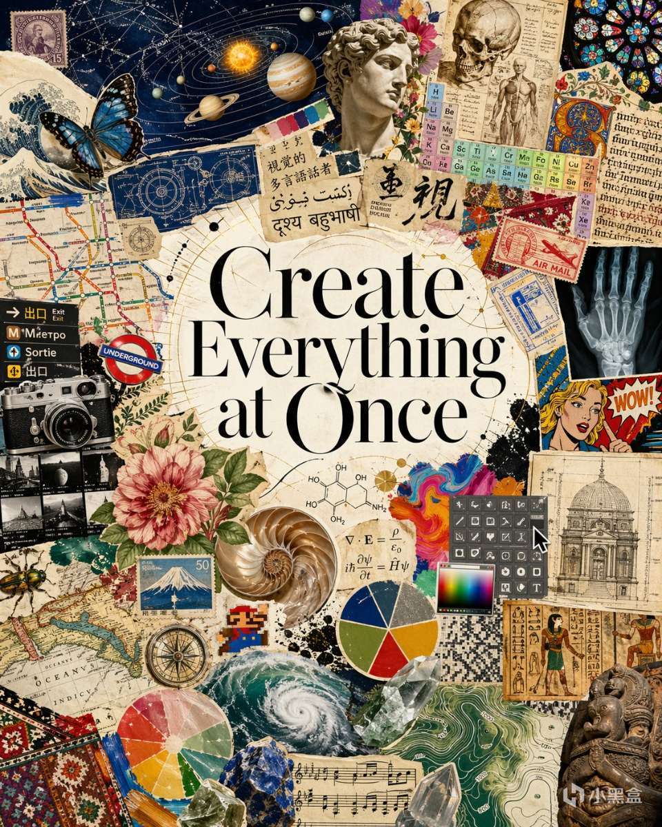 Use an unstructured, creative and artistic layout, such as but not limited to fan out, avoid grid-like layouts. Portrait 4:5 aspect ratio. Don't add any content text beside the "Create Everything at Once" title. Text as part of the art is okay.