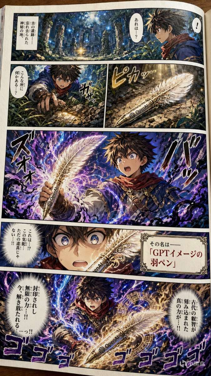 Make a sample page of a colorized Japanese shonen adventure manga. The page should vividly depict our main character found a magical quill. The name of the quill is called the Quill of GPT Image. Make it dramatic. The magical quill has strong power sealed inside it.