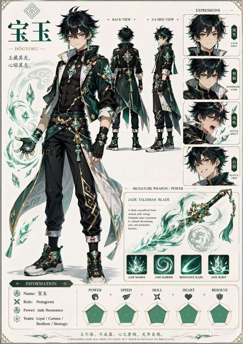 Based on everything you know about me, make a character sheet of shonen-style anime character of me, name is 宝玉