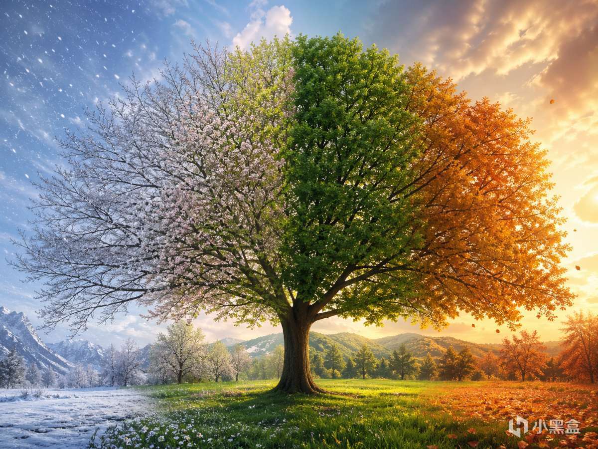 There are no visible dividing lines between seasons; the weather, lighting, and vegetation blend smoothly to create a unified and harmonious panorama. Rich in detail, symbolic of the passage of time, cinematic lighting, 8k resolution, highly detailed textures. --ar 4:3