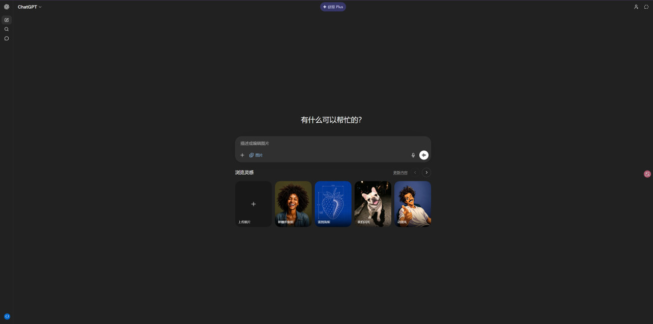 这是最便捷的使用方式,无需复杂操作,入口就是对话输入框的「+」号→「创建图片」。免费用户可体验基础功能,Plus/Pro用户可解锁全部权限,适合大多数人日常使用。