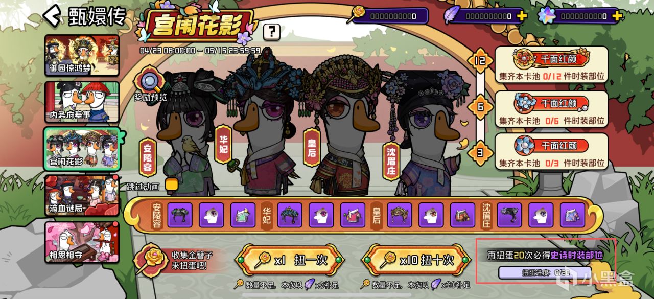 宫闱花影任务扭蛋 20 次必得史诗时装部位。