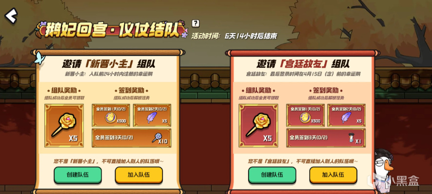 除了日常获取,限时活动也能快速囤簪子。4 月 23 日到 4 月 29 日期间,参与宫廷故友组队活动,拉上 4 月 15 日前就没登录的老玩家组队,组队成功直接送 5 根金簪子。
