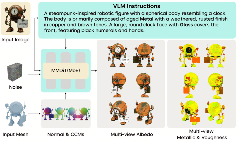同时该模型还引入了MoE架构的统一PBR生成模型,结合VLM先验知识,实现高分辨率材质细节和精确的金属粗糙度边界生成,即使在未知光照条件下也能稳定进行材质分解。
