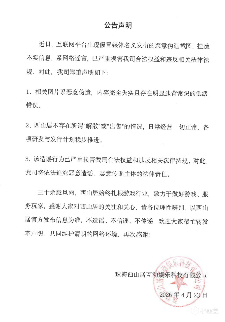 对于这种严重损害公司合法权益、违反法律法规的造谣行为,西山居表示将依法追究恶意造谣、传谣主体的法律责任。