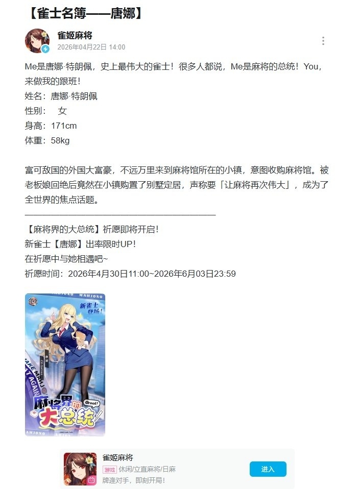 昨天,雀姬麻將公佈了新雀士“唐娜”,似乎造型十分別致,大家一起看看吧
