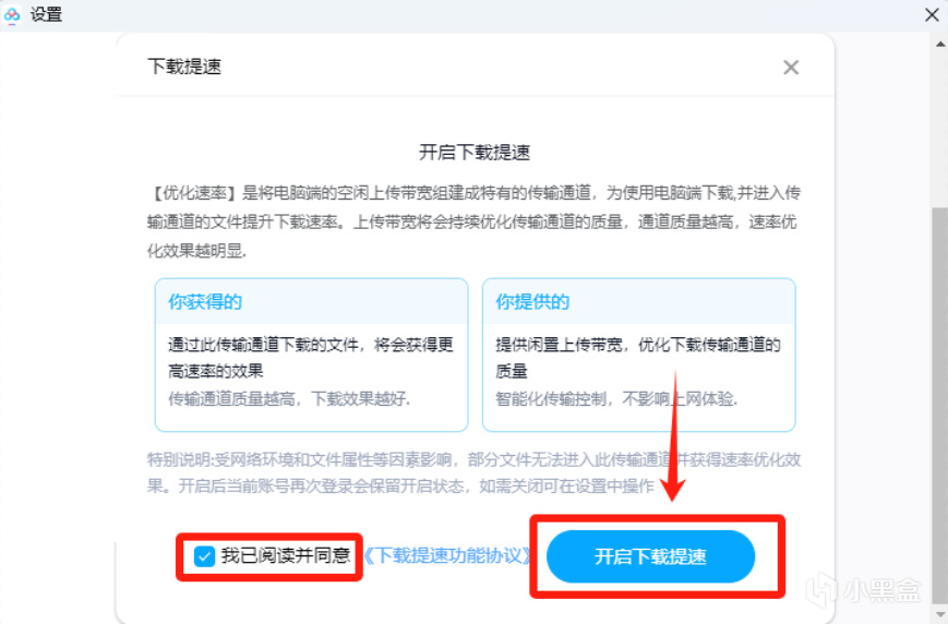 勾选 我已阅读并同意 ,然后点击 开启下载提速