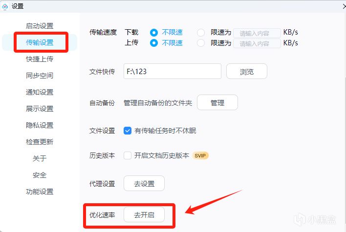 进入设置页面,找到 传输设置