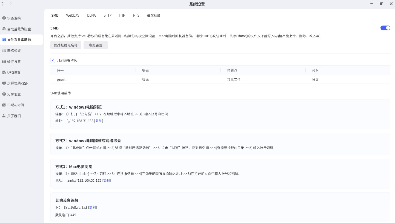 2、确认挂载设备已开启SMB协议:NAS默认开启SMB协议,无需手动操作,我这台是极空间,在系统设置里的文件及共享服务里设置,IP地址等都写的很清楚。