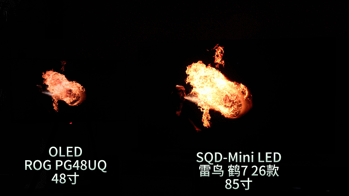 暗部是OLED的优势所在,因其可以彻底关闭像素点亮度,所以可以做到无限对比度,从下图看,SQD-MiniLED的暗部也基本是纯黑,尤其是在纯黑背景下,几乎可以媲美OLED的暗部了,而且火光的高亮比OLED要强的多,倒不是说OLED不好,我认为在常看HDR内容的电视上,MiniLED技术真的太适合了。