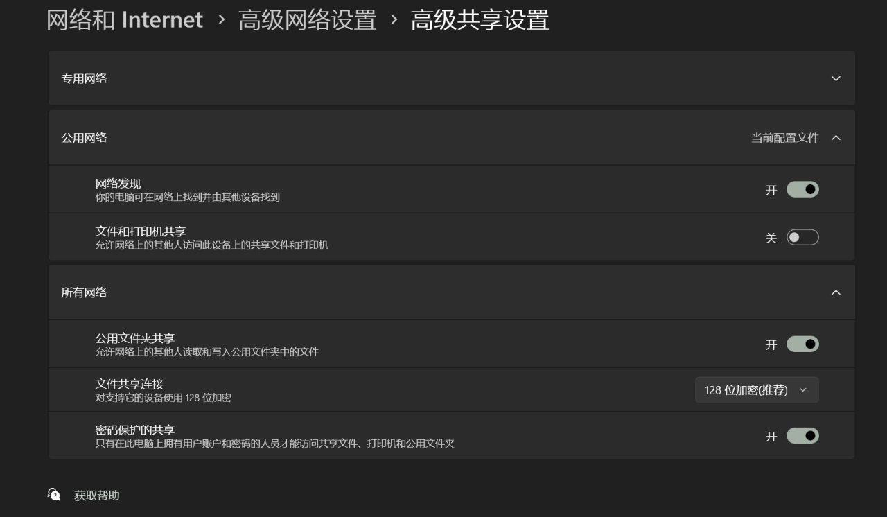 电脑(Windows系统)需打开:控制面板 - 网络和Internet - 高级网络设置 - 高级共享设置,开启「网络发现」和「文件和打印机共享」,并设置共享文件夹,将高清片源放入共享文件夹,设置「允许访问权限)」,这个方法还是有点麻烦,毕竟电脑得开着,还要折腾电脑文件夹,后面还需要得知自己在内网的IP地址。