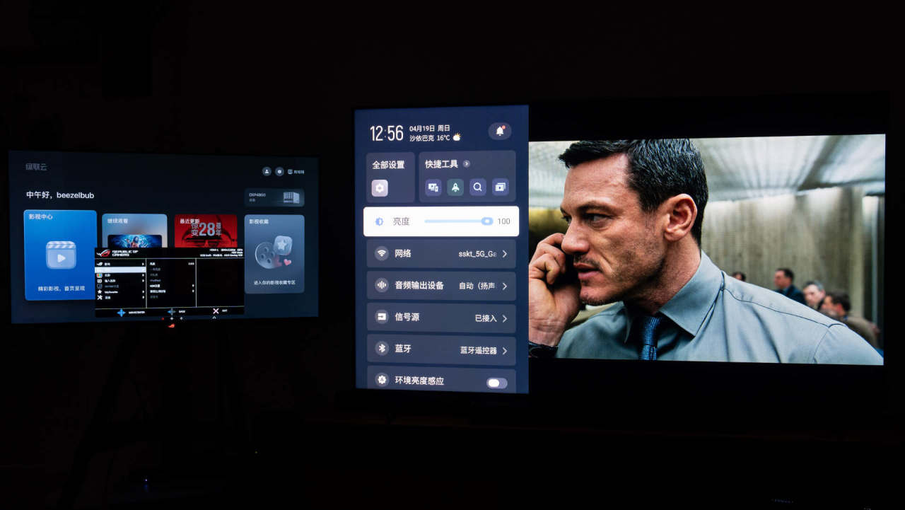 下面的片源是安娜蓝光原盘双杜比,70GB的原文件,左边通过水果电视,右边是芝杜蓝光播放器,其实播放器的差距不太大,至少亮度上差距不大,可以看到SQD-MiniLED的高亮效果非常明显,ROG这台是900尼特,其实在三年前的OLED上表现也不算差了,而雷鸟这台是2200nits的峰值亮度。