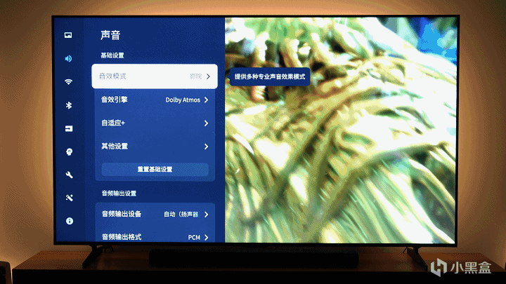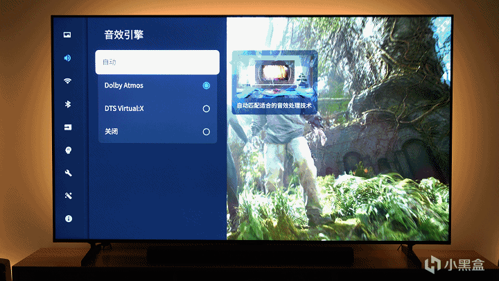 音效引擎选择:Dolby Atmos,环绕感觉更好,这台电视自带ONKYO安桥2.1.2音响,60W功率比不过上千的回音壁,但比很多入门音响要强,环绕感也是有的。