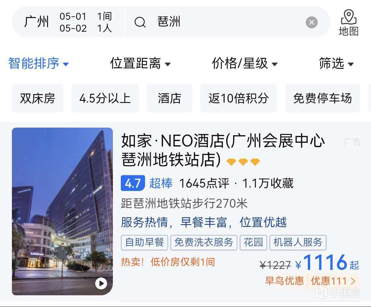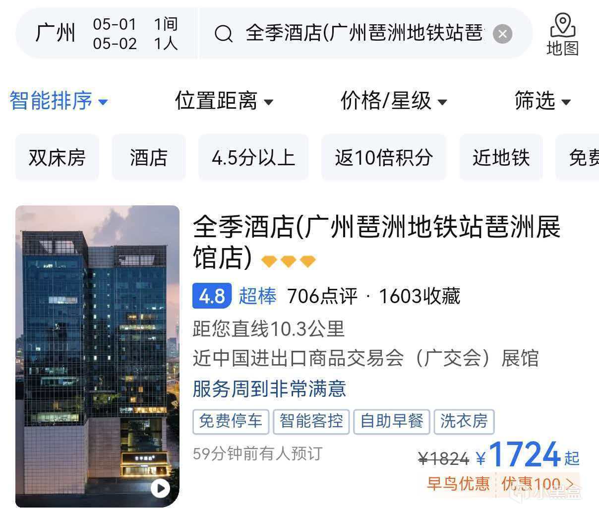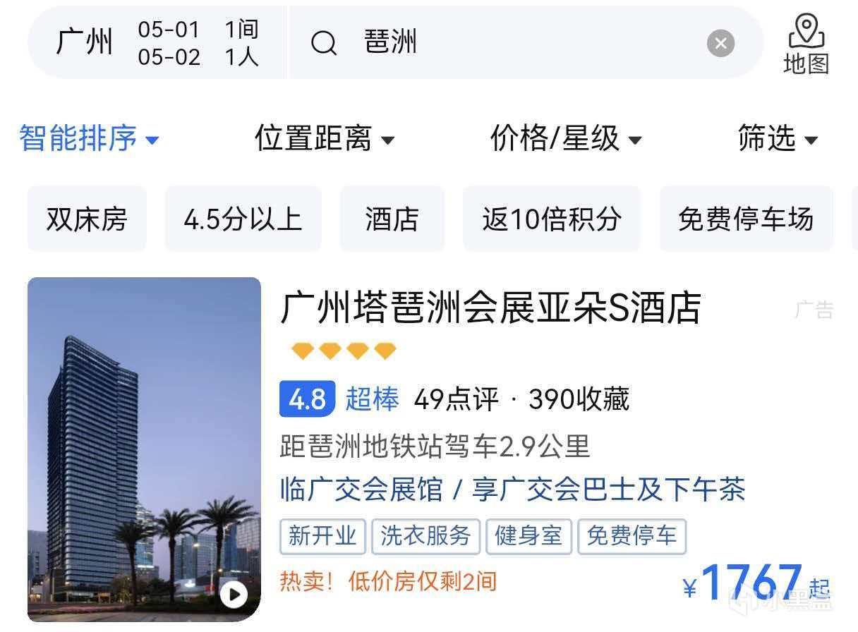 就拿广州来说,五一期间本就人多,还遇上广交会和萤火虫漫展,周边酒店的价格都暴涨。如果提前买票并且直接订好酒店的话,可以说还没出家门,旅行的经费就少一大半了。某平台上琶洲附近部分品牌酒店的价格。如图