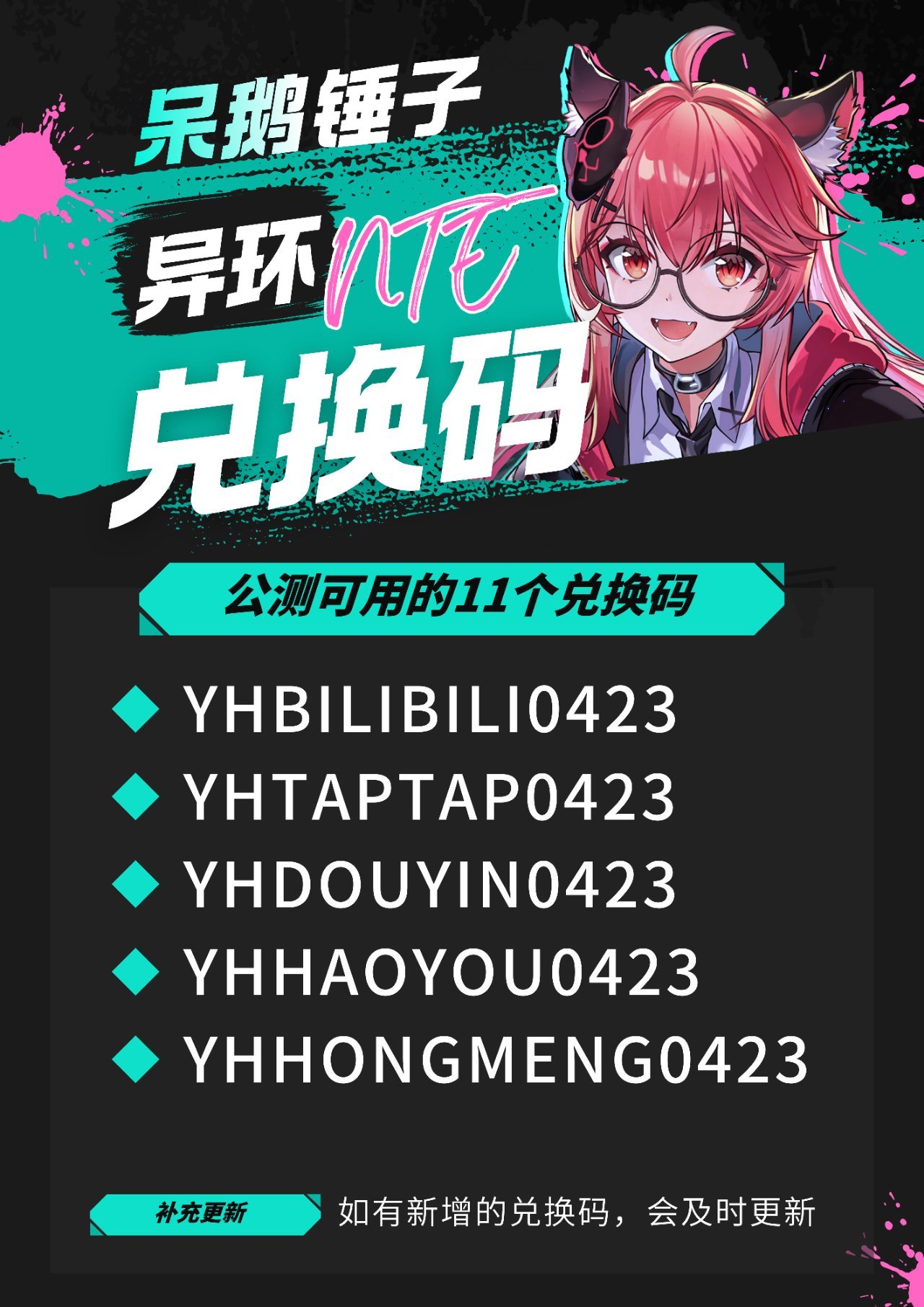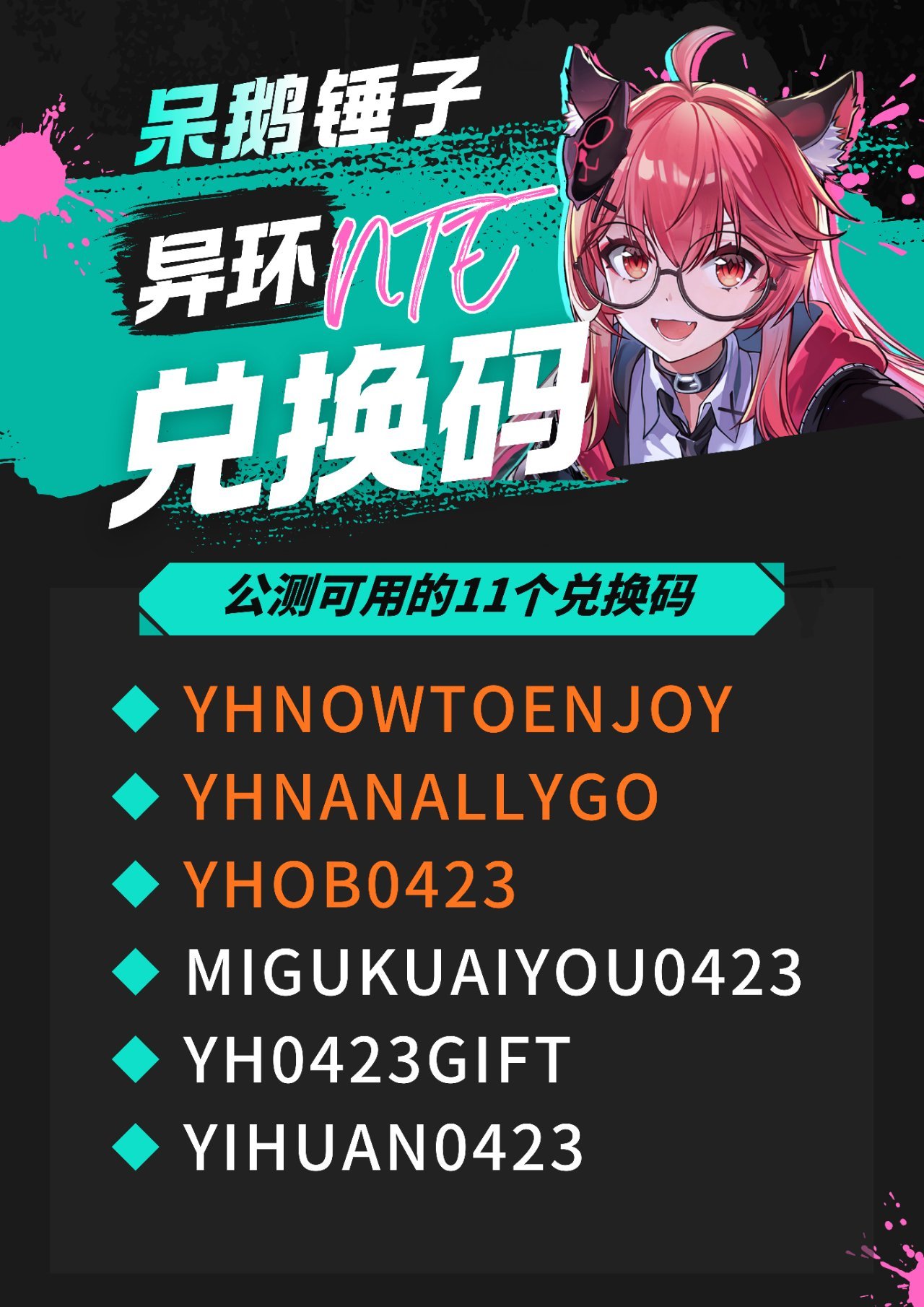 【异环】公测可用的11个兑换码一览 2026-04-23 手机游戏 经过@呆鹅锤子老师的授权,之后异环的内容会在这里更新。大家如果喜欢别忘了去红薯平台关注一下老师,内容非常优质。也可以关注一下我,之后会持续搬内容。 更多游戏资讯请关注:电玩帮游戏资讯专区 电玩帮图文攻略 www.vgover.com
