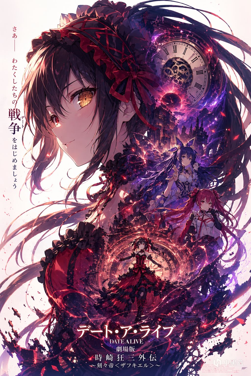 生成日系二次元动画电影海报,anime key visual风格,双重曝光构图,浅色或柔和渐变背景。 时崎狂三为主体角色,大比例正面或侧脸构图,黑红哥特风服装,长发飘动,异色瞳清晰(钟表眼细节),表情神秘又危险。 剪影内部融合巨大时钟、齿轮结构、崩坏城市、空间裂隙与灵力波动等元素,营造时间与破坏的视觉主题。 夜刀神十香、五河琴里等角色以标准二次元立绘形式融入背景或剪影内部,比例协调,画风统一。 整体色彩以黑、深红、紫色为主,辅以高亮金色或血红光效,强对比但保持干净上色(cel shading),光影集中在灵力与时间结构上。 加入发光描边(glow)、能量粒子与轻微梦幻光晕效果,但避免写实纹理与厚重颗粒。 画面氛围:浪漫、危险、诱惑与毁灭感并存,带轻微中二感与戏剧张力。 构图简洁,有设计感与留白,类似剧场版动画官方主视觉海报,竖版。