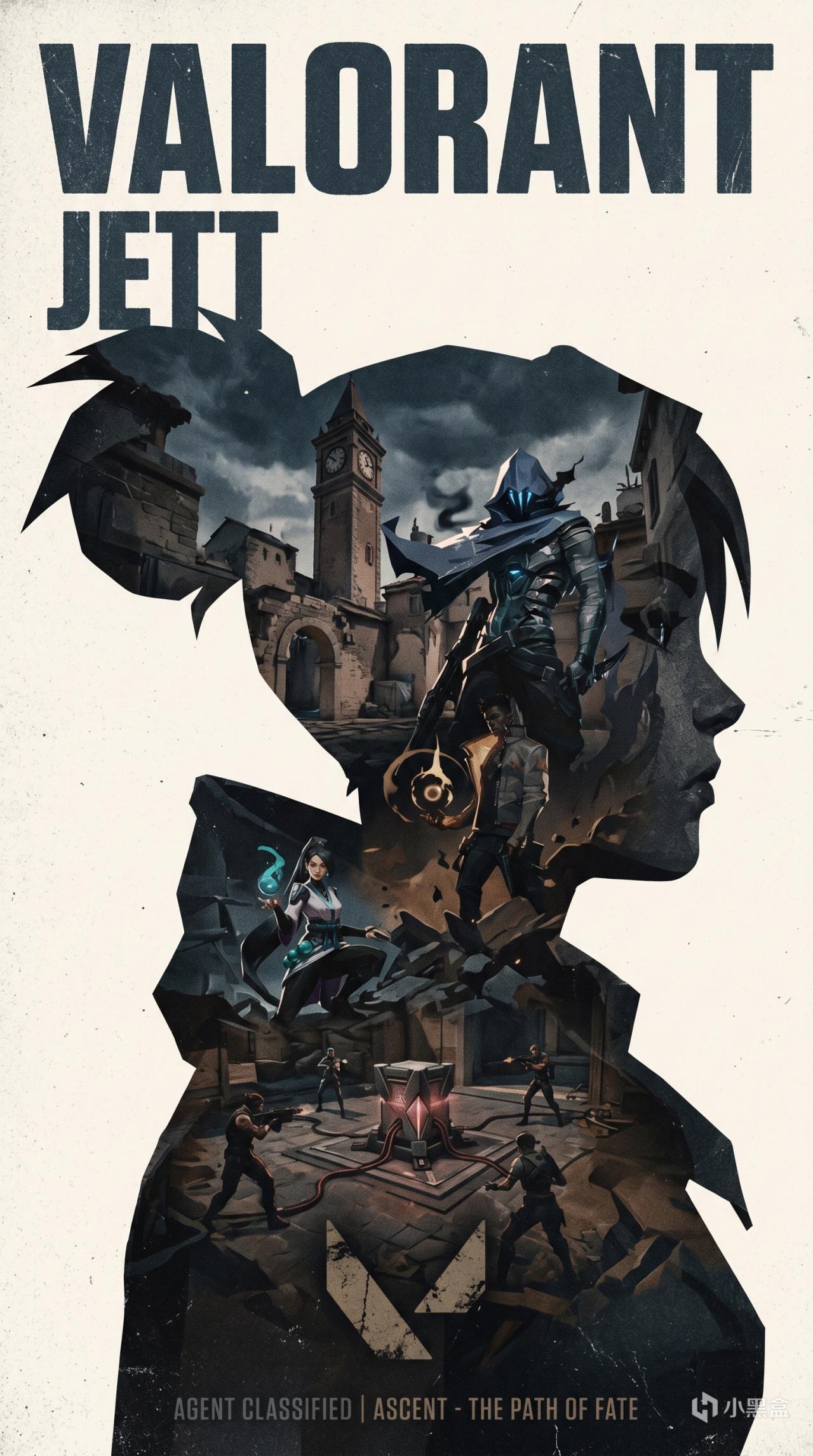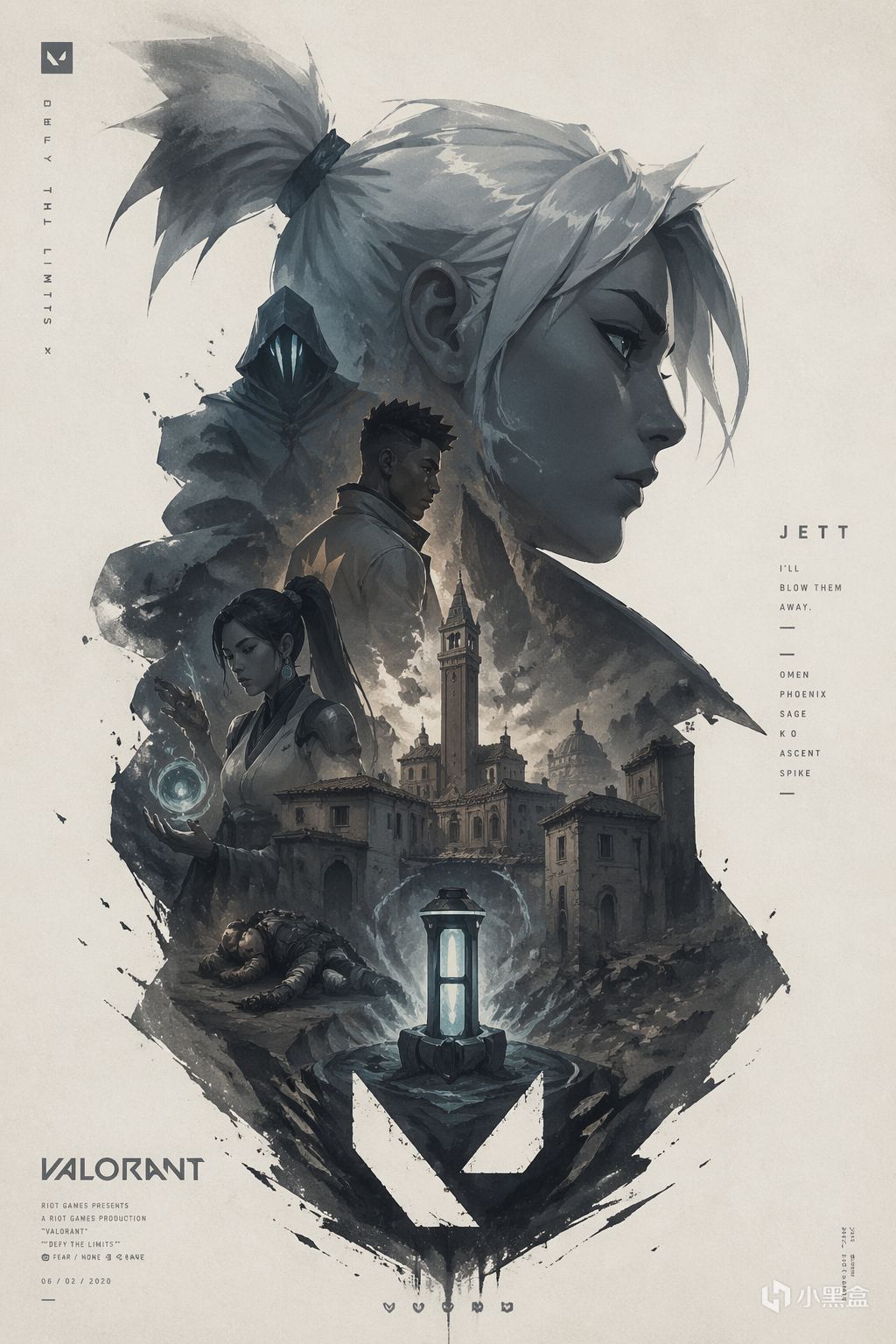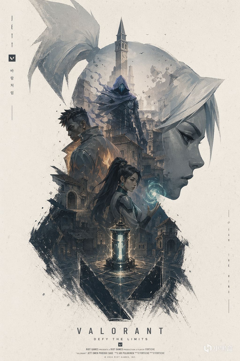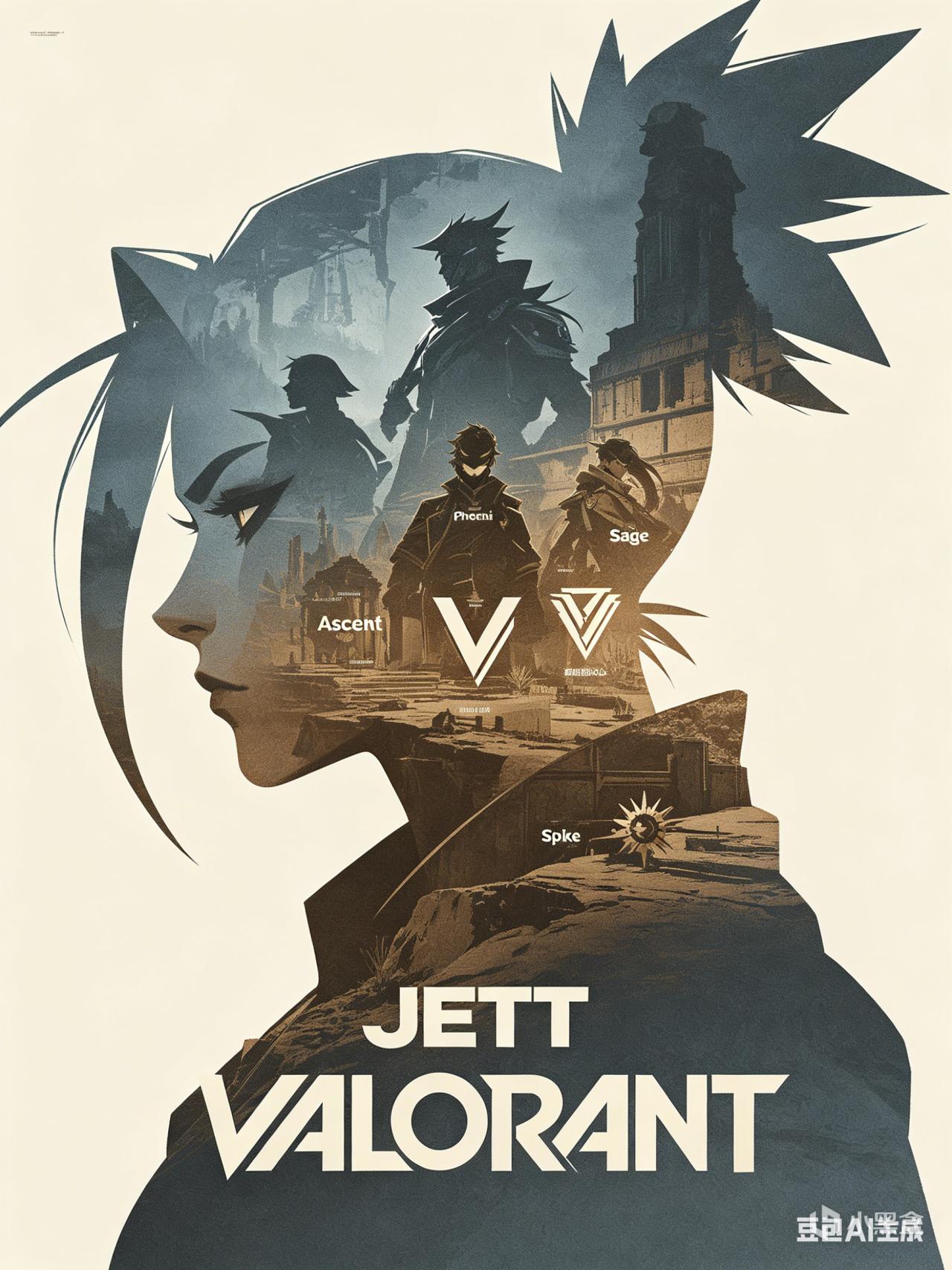 生成高完成度史诗感艺术海报,双重曝光构图,米白色背景,游戏:无畏契约(Valorant),捷风(Jett)的侧脸大剪影占据主体,剪影内部融合幽影(Omen)、不死鸟(Phoenix)、贤者(Sage)、亚海悬城(Ascent)漂浮岛屿场景、辐能核心(Spike)与无畏契约V字徽章等元素。整体以灰蓝、土褐为主,压抑、决绝、宿命感极强,大量留白,印刷颗粒质感,像正式院线动画电影海报,竖版。