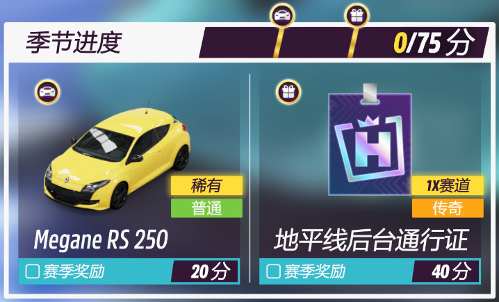 夏季赛20分进度奖励为2010款雷诺 Megane RS 250和40分进度奖励为地平线后台通行证