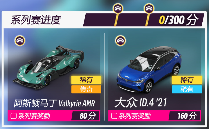 S59赛季系列赛80分进度奖励为2022款阿斯顿马丁 Valkyrie AMR Pro和160分进度奖励为2021款大众 ID.4