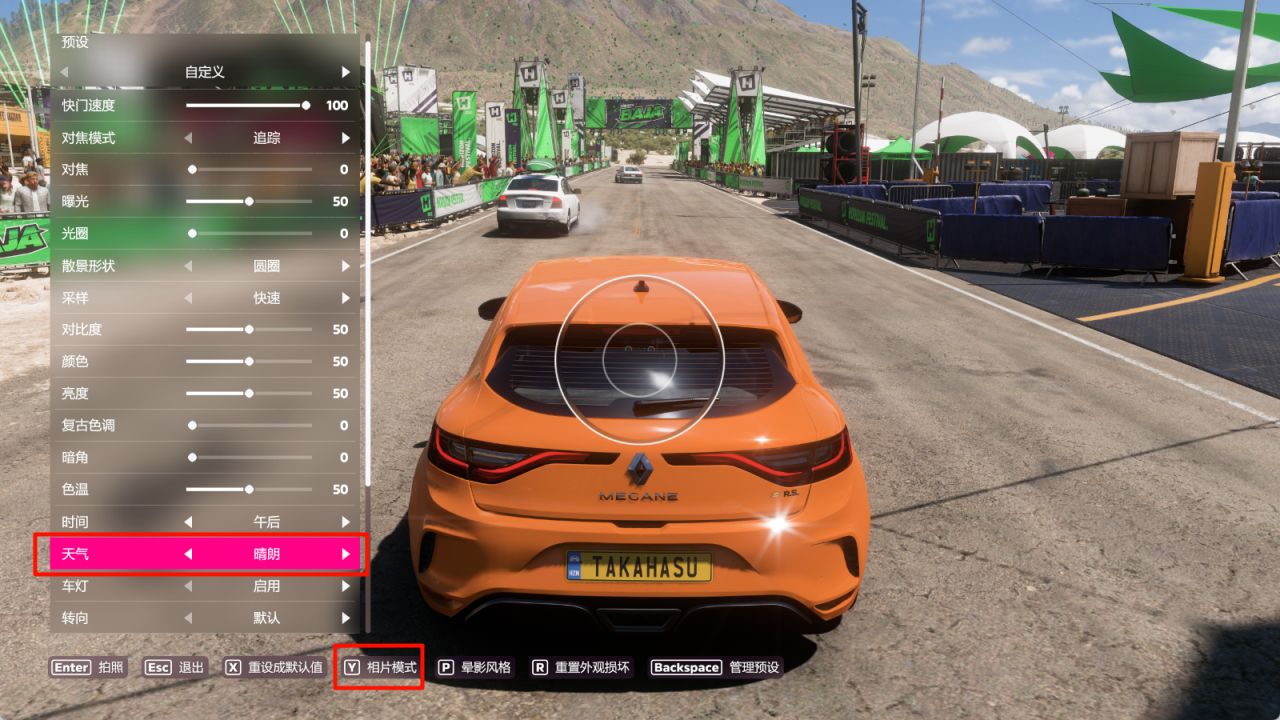 在雨中拍摄任意雷诺的相片(按P拍照,在设置里调节天气)