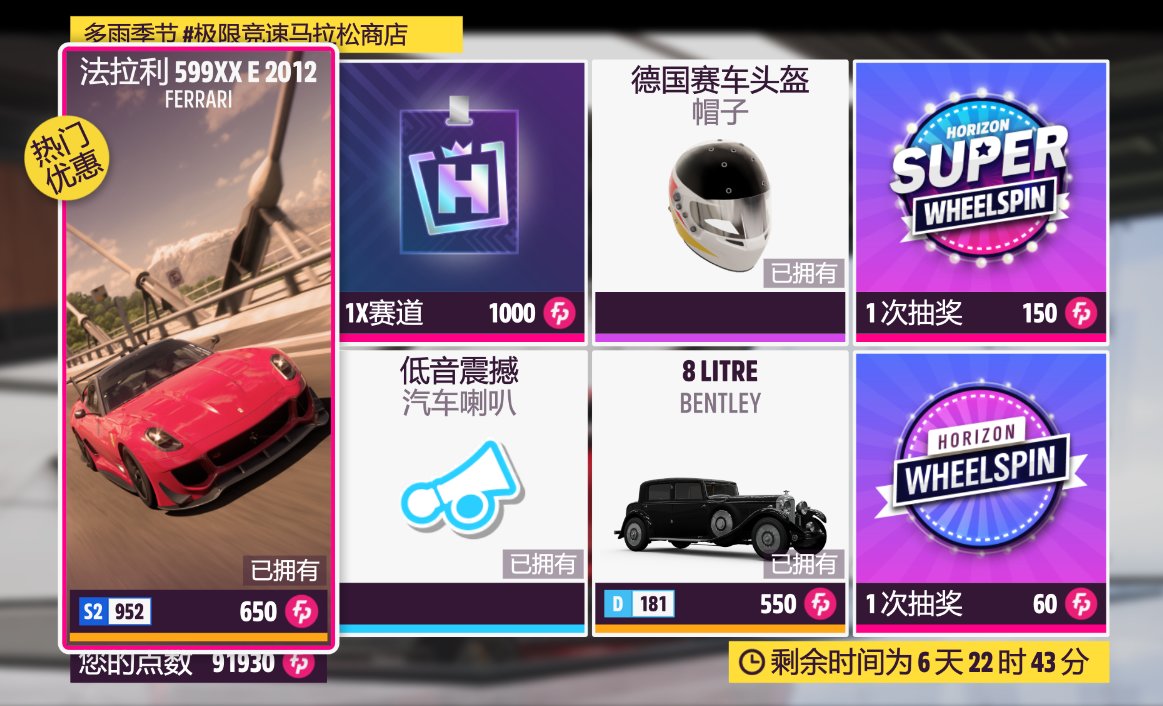 地平线后台通行证可以赶紧兑换,目前后台车全部返场了,可以尽情兑换了;低音震撼汽车喇叭、德国赛车头盔没有的建议大家兑换。每周更新的衣服和喇叭等没有的建议大家无脑兑换!