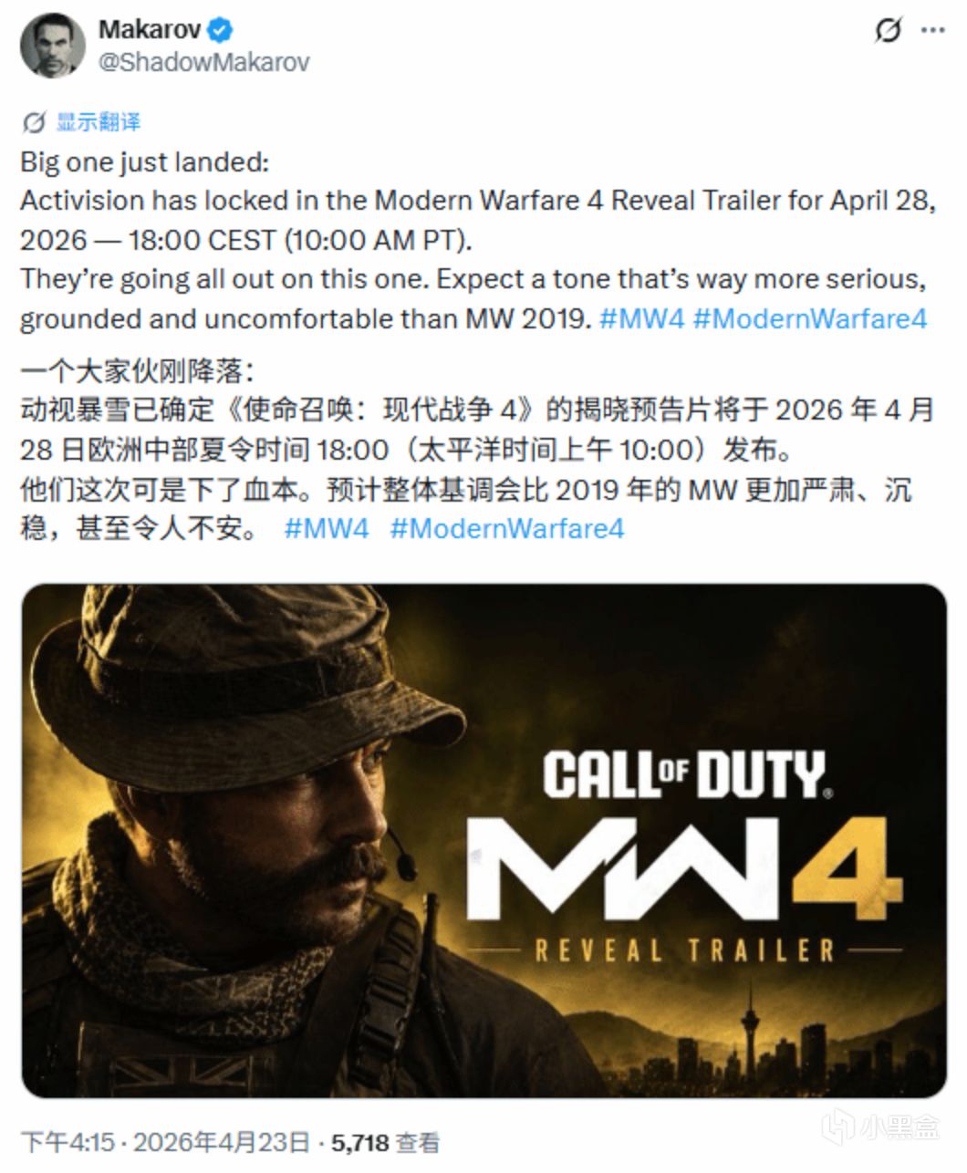 有爆料称《使命召唤:现代战争4》首支预告片将于2026年4月29日北京时间凌晨0:00发布,预计会是一场规模较大的亮相。据透露,新作的氛围将比2019年的重启版更加黑暗、写实,甚至带有一种直击人心的“压抑感”。